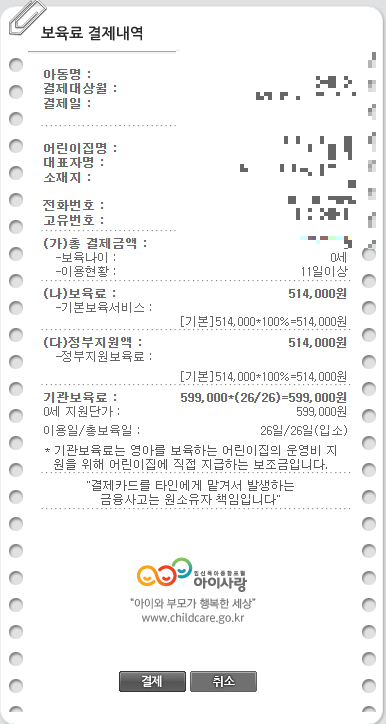 위 와 같이 국민행복카드를 통해 보육료 결제방법에 대해 알아보았습니다. 어렵지 않지만 한 달에 한 번 결제를 진행하다 보니 잘 모르시는 경우가 있기에 이 포스팅을 보시고 참고하여 활용해 보시길 바랍니다.