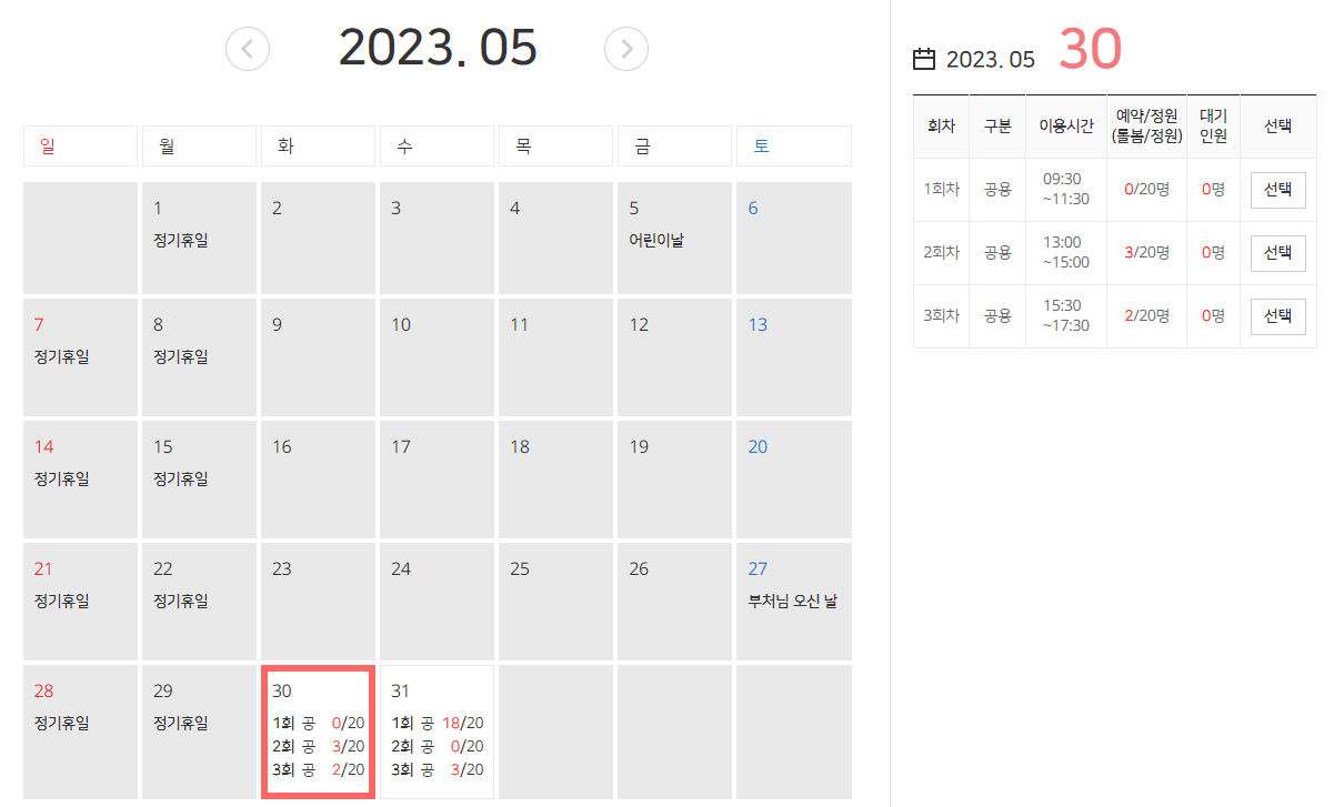 이용하고자 하는 날짜 클릭 후 예약 및 정원을 확인합니다. 각 지점별로 회차, 정원이 조금씩 상의하므로 참고하시길 바랍니다.